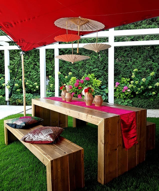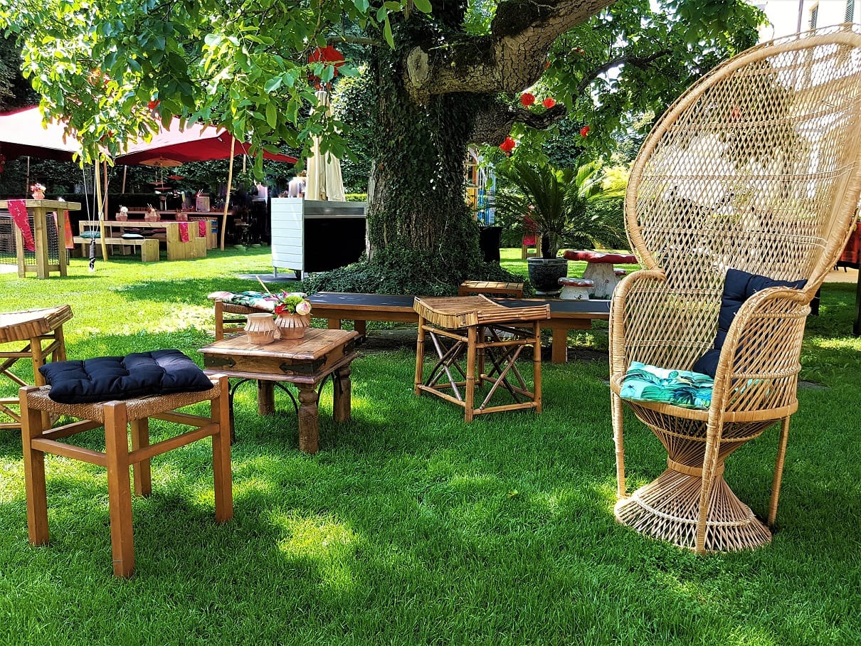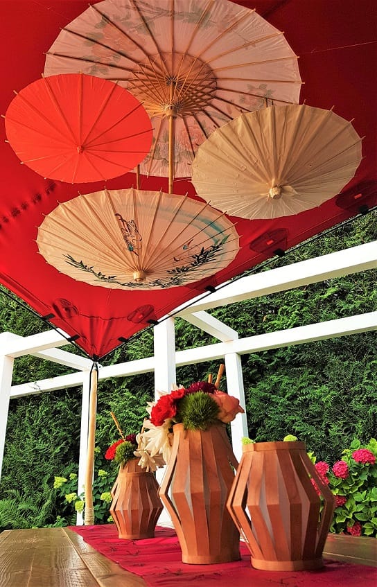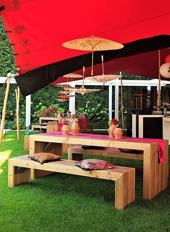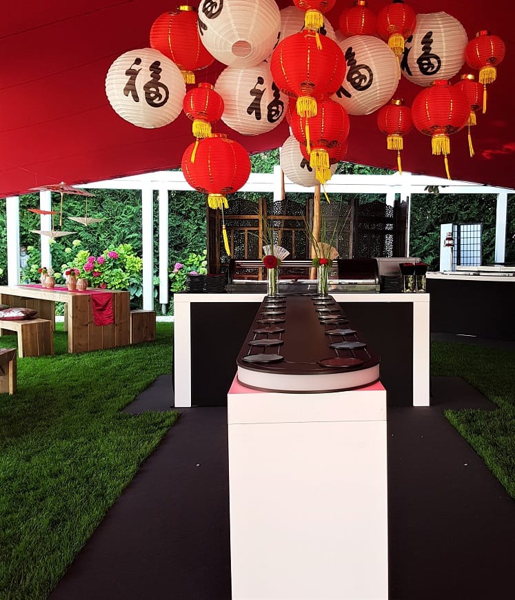 An afternoon event in a private garden in Munich. Equipped with seating and bar tables made of light-coloured wood, broken up by bright red table runners that created a lively contrast. Asian paper umbrellas hanging in groups visually emphasised the table groups and highlighted them in style. Bamboo and raffia provided natural accents, and lanterns hung in the trees added an Asian feel. The eye-catcher in the centre of the tent was a running sushi as a culinary highlight.