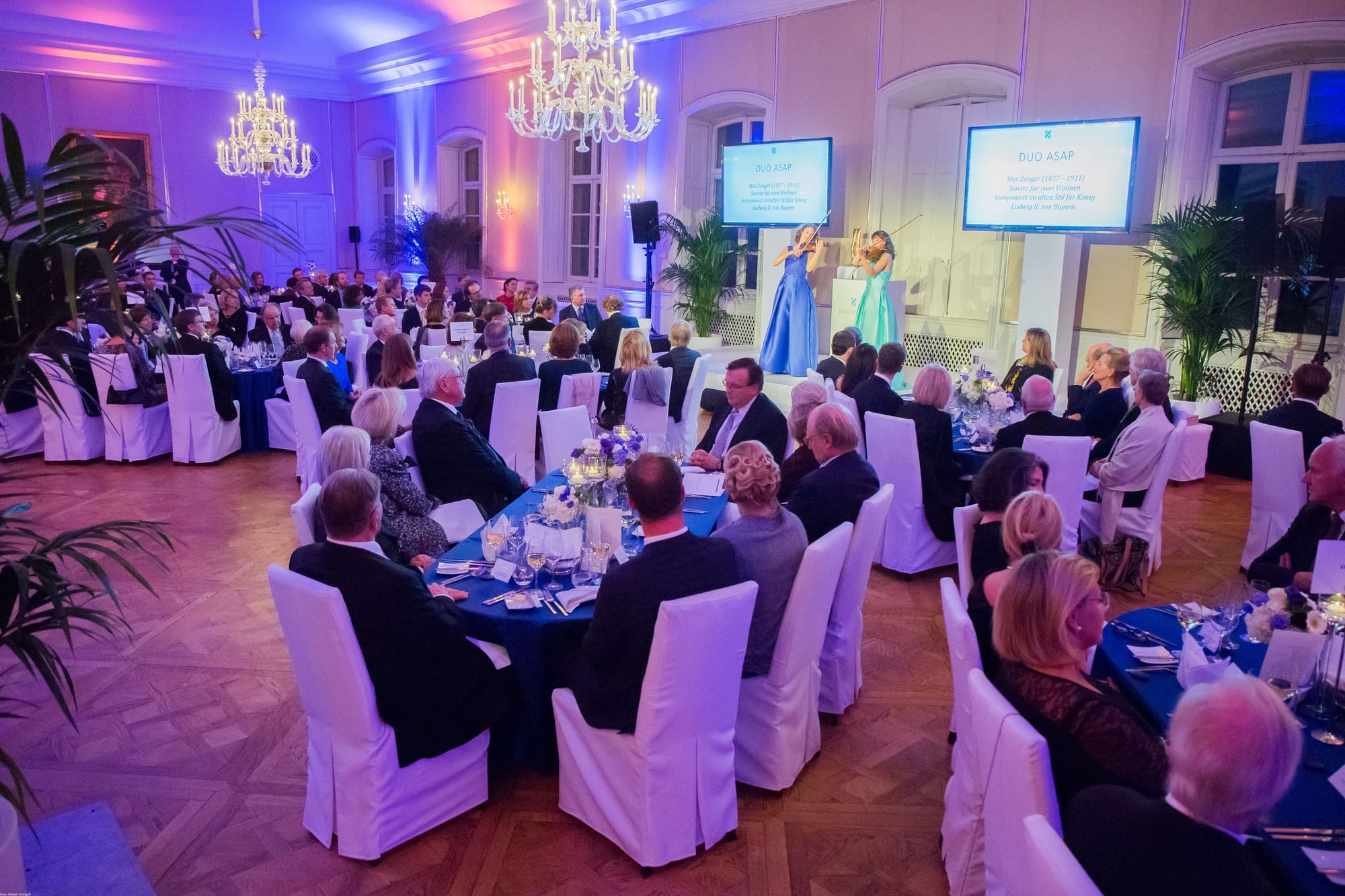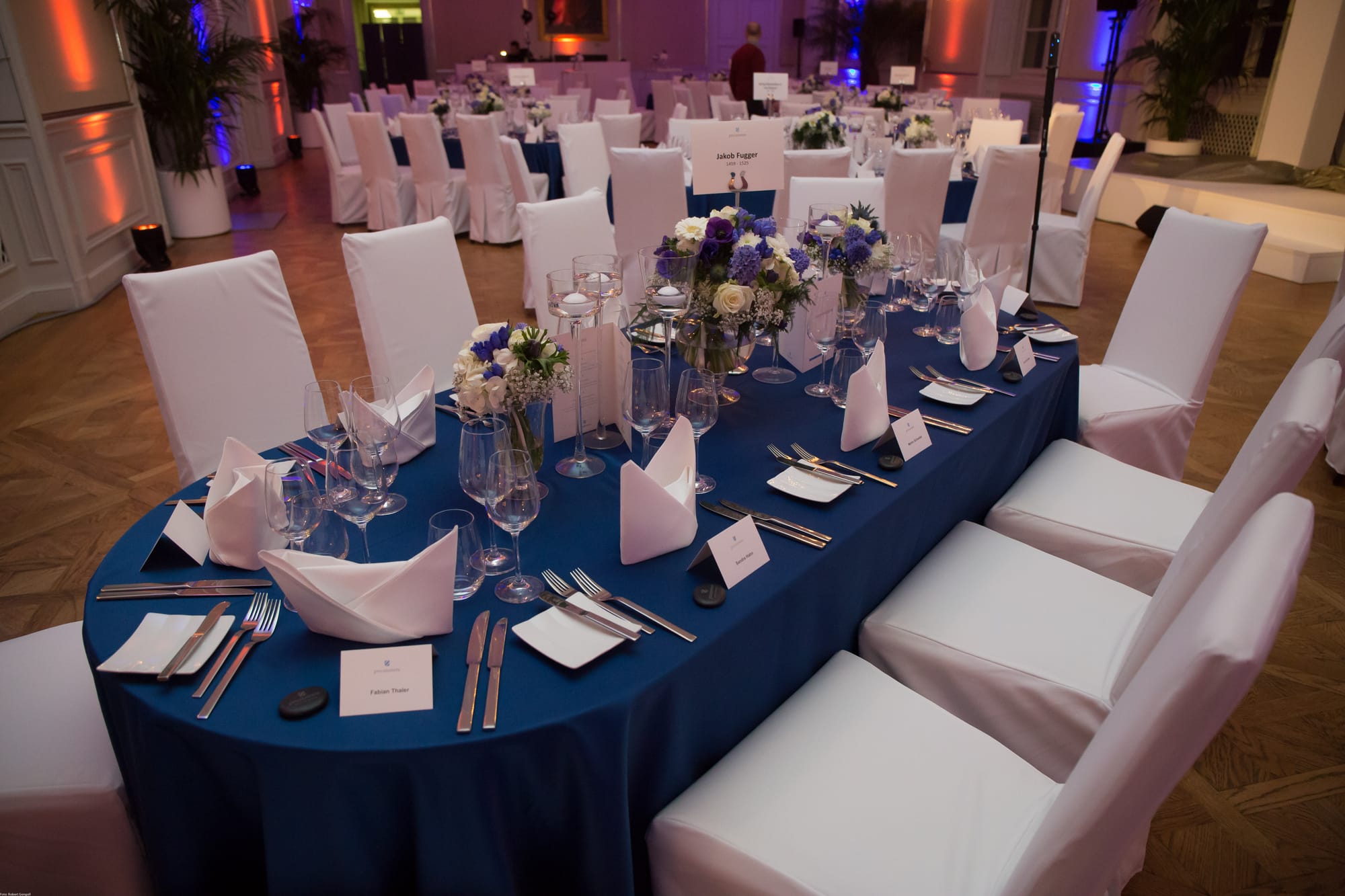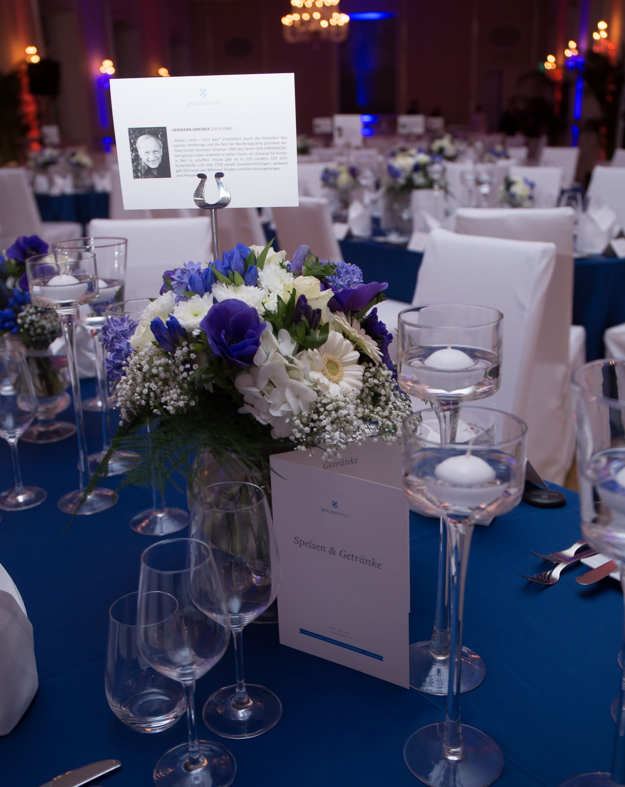 An evening event in the magnificent Hubertussaal at Nymphenburg castle in Munich. Glamorous and elegantly designed in the colours blue and white, inspired by the logo of ‘Pro.movere’ as part of the Care for Rare Foundation. The highlight of the evening was the ‘royal’ visit of Queen Silvia of Sweden and Duke Franz of Bavaria. In collaboration with the event agency Needed